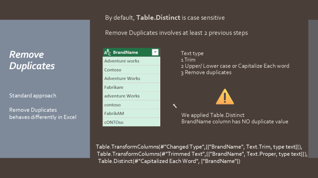 Applying a correct Remove Duplicates in Power Query, implies 2 steps before Table.Distinct.